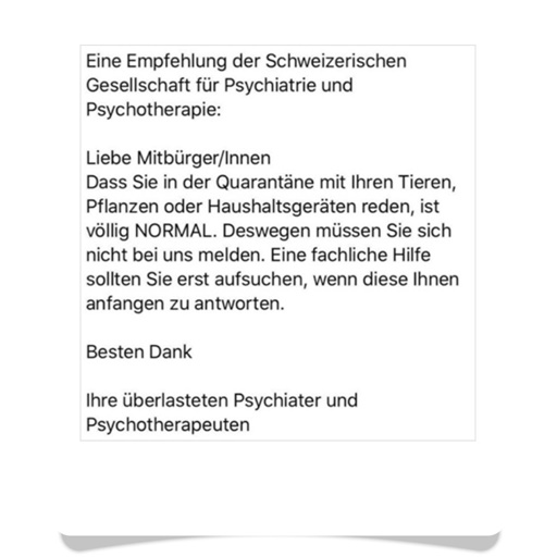 Und... vielleicht ist im nebenstehenden Text - Empfehlung der Schweizerischen Gesellschaft für Psychiatrie und Psychotherapie - bei allem Humor, sogar mehr Wahrheit zu finden, als es darüber zu Lachen gibt. Schmunzeln musste ich dabei schon.